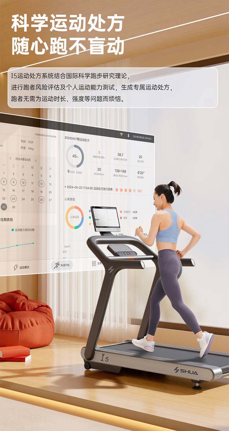 jiuyou.comSH-T580T I5跑步机,科学运动处方,随心跑不盲动,可根据个人运动处方心率区间及跑者的实时心率情况,自动调节速度或坡度,犹如你的专属“配速员”让你随“心”而跑无负担。